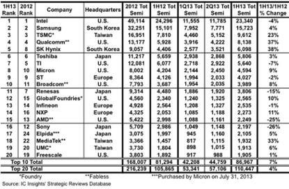 此外,排名迅速提升的其他公司還包括進入前10大的博通公司(Broadcom),以及在2013年7月31日正式由美光公司收購的爾必達(Elpida)。(美光與爾必達的銷售組合將為Micron-Elpida新公司在2013年上半年帶來67億美元的銷售營收,並使其排名進展到第五。)