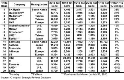整體來看,2013年上半年全球前20大半導體公司的銷售額較2012上半年成長了4%,較2013上半年整體全球半導體市場3%的年成長率更多了1%。